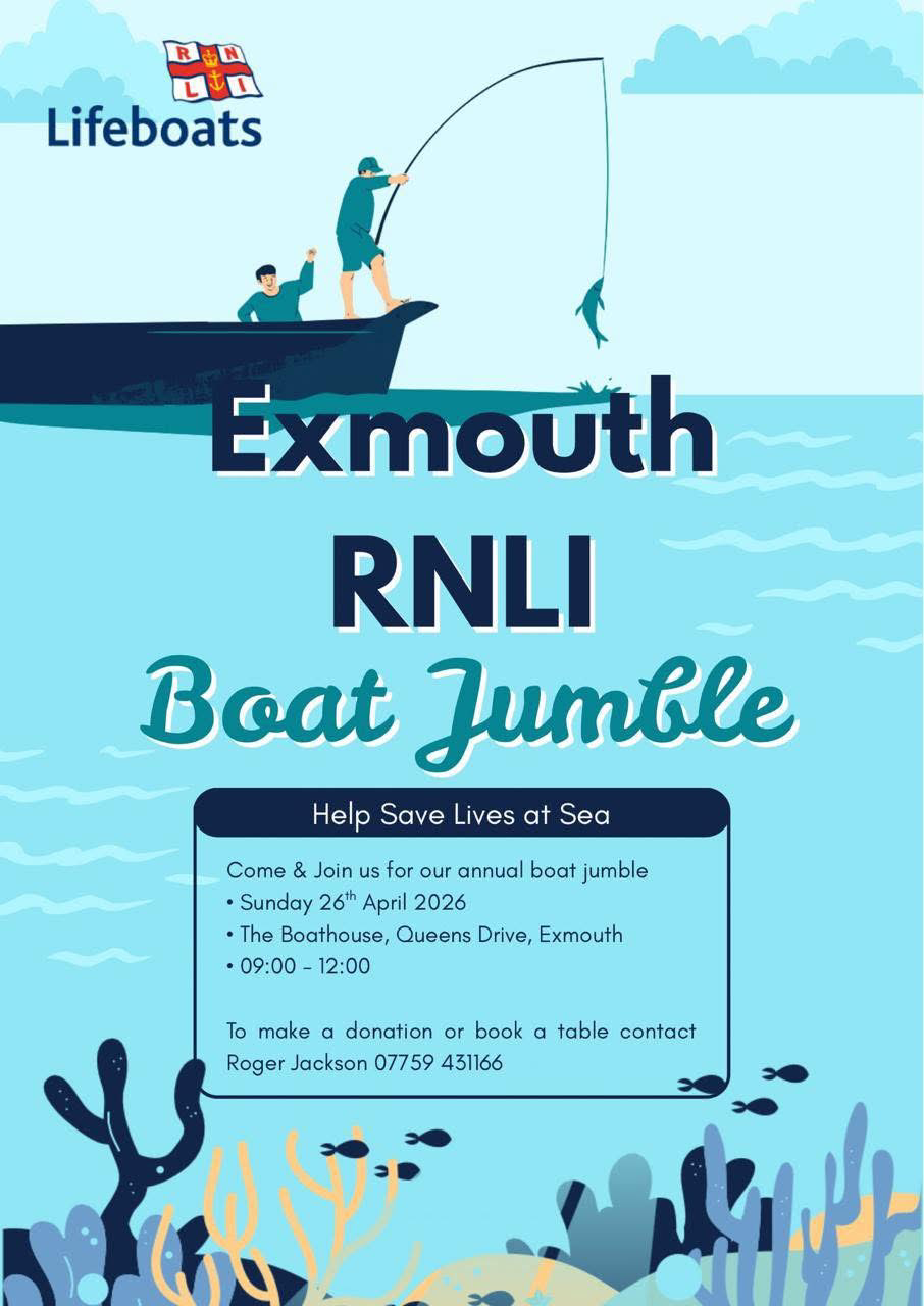 Jul 11 2026 11 Jul 2026 6:30 pm Exmouthg RNLI Summer Ball 2026 Sandy Park + Google Map Apr 26 2026 26 Apr 2026 9:00 am - 12:00 pm Exmouth RNLI Boat Jumble Exmouth Lifeboat Station + Google Map